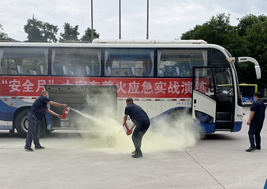 在演練時(shí),隨著滿載乘客的大客車行駛至劉電賓館門前,突然行李艙起火,大客車駕駛員在突然遇火險(xiǎn)緊急情況下,立即開啟應(yīng)急雙閃燈,靠邊停車,打開車門,迅速引導(dǎo)車內(nèi)乘客有序疏散,并要求大家用濕毛巾捂住口鼻,彎腰依次撤離到車外安全地帶。緊接著滅火組演練人員迅速行動(dòng)起來,熟練地取出車載滅火器,拔下滅火器安全銷,用噴口對(duì)準(zhǔn)火源根部,及時(shí)將火撲滅,救護(hù)組及時(shí)疏散和救援下車人員,并對(duì)傷員身體狀況進(jìn)行基本護(hù)理和檢查。整個(gè)演練過程既緊張,又有條不紊,進(jìn)一步增強(qiáng)了全體員工的安全意識(shí),真正掌握了交通工具突發(fā)火險(xiǎn)后迅速逃生、自救、互救的基本方法,達(dá)到了演練的預(yù)期目的。