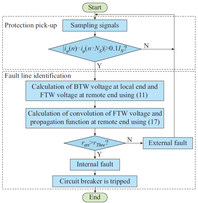 典型的換流器故障控制策略雖能弱化故障特征,但在故障暫態(tài)階段,故障特征主要受到海纜中電容和電感間能量交換的影響。同時(shí),換流器控制系統(tǒng)完成指定目標(biāo)需要一定時(shí)間,因此故障支路電流在故障暫態(tài)階段幅值較大并逐漸減小。充分利用該階段的故障信息,即可實(shí)現(xiàn)故障識(shí)別。鎧裝三芯海纜包含導(dǎo)芯、金屬屏蔽層和鎧裝,多導(dǎo)體之間存在電磁耦合,單獨(dú)分析相電氣量困難。對(duì)此,首先利用時(shí)域暫態(tài)信號(hào)相模變換,篩選出能夠反映各種故障類型的模量。Marti模型考慮了線路頻變特性,能夠根據(jù)對(duì)端電壓前行波準(zhǔn)確計(jì)算本端電壓反行波。為了在低采樣率下實(shí)現(xiàn)計(jì)算,推導(dǎo)了基于插值的高精度電壓反行波電壓表達(dá)式。基于電壓反行波差異的海上風(fēng)電低頻輸電系統(tǒng)海纜縱聯(lián)保護(hù)方案流程圖如圖2所示。保護(hù)啟動(dòng)后,首先根據(jù)本端模量信息計(jì)算本端電壓反行波,然后通過對(duì)端電壓前行波與傳播函數(shù)間的卷積來計(jì)算本端電壓反行波,最終比較二者差異以實(shí)現(xiàn)海纜保護(hù)。