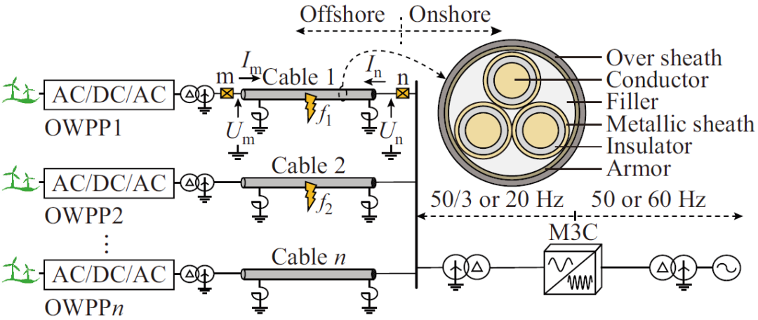 圖1給出了海上風(fēng)電低頻輸電系統(tǒng)拓?fù)?,海纜需匯集來自于風(fēng)電場(chǎng)的電能,并經(jīng)模塊化多電平矩陣換流器(modular multilevel matrix converter,M3C)實(shí)現(xiàn)頻率轉(zhuǎn)換,從而在M3C低頻側(cè)構(gòu)成了100%電力電子源場(chǎng)景。相較于同步機(jī)系統(tǒng)在負(fù)序網(wǎng)絡(luò)中源側(cè)只體現(xiàn)阻抗特性,低頻輸電系統(tǒng)負(fù)序網(wǎng)絡(luò)中線路兩側(cè)均可體現(xiàn)為電源特性。根據(jù)單相接地故障和兩相相間故障復(fù)合序網(wǎng)圖,故障支路電流可由負(fù)序電流唯一確定,當(dāng)M3C和海上風(fēng)電場(chǎng)網(wǎng)側(cè)變流器(grid-side converter, GSC)抑制負(fù)序電流時(shí),盡管故障點(diǎn)處存在負(fù)序電壓源,但兩側(cè)換流器均會(huì)生成幅值相位相同的電壓源,以抵消系統(tǒng)中的負(fù)序電流,因此系統(tǒng)故障電流仍保持對(duì)稱,使得故障支路的穩(wěn)態(tài)電流為0。上述分析表明,雖然風(fēng)電場(chǎng)升壓變壓器和M3C低頻側(cè)隔離變壓器網(wǎng)側(cè)中性點(diǎn)均采取直接接地方式,但低頻輸電系統(tǒng)在特定故障控制策略下呈現(xiàn)出類似于中性點(diǎn)非直接接地系統(tǒng)的故障特征。
