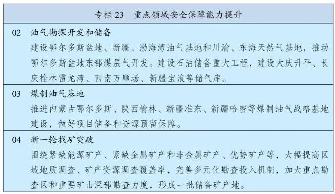《綱要》提出,要強化能源資源供應保障,要堅持立足國內(nèi)、補齊短板、多元保障、強化儲備,加強能源產(chǎn)供儲銷體系建設。堅持油氣核心需求自主保障,實施中長期油氣增儲上產(chǎn)戰(zhàn)略行動,確保原油年產(chǎn)量穩(wěn)定在2億噸左右、天然氣產(chǎn)量穩(wěn)步增長,加強煤制油氣產(chǎn)能和技術儲備。強化政府儲備和企業(yè)儲備協(xié)同,提升國家石油儲備規(guī)模,建立更加靈活的輪換動用機制,增強天然氣儲備調(diào)節(jié)保障能力,完善煤炭儲備體系。健全能源保供中長期合同制度,完善電力應急調(diào)度機制和備用電源配置,強化能源需求側(cè)管理。加強戰(zhàn)略性礦產(chǎn)資源勘探開發(fā)和儲備,深入實施新一輪找礦突破戰(zhàn)略行動,統(tǒng)籌加強產(chǎn)品、產(chǎn)能和產(chǎn)地儲備,推動大宗商品儲運基地建設,提升戰(zhàn)略性礦產(chǎn)資源安全風險監(jiān)測預警和應急保供水平。加強能源資源開發(fā)國際合作,維護戰(zhàn)略通道安全。