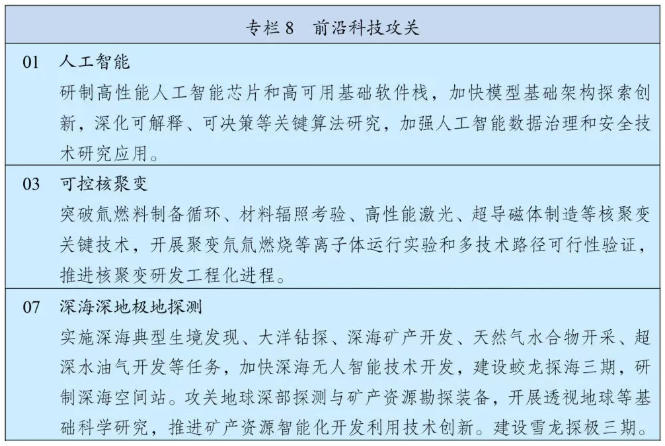 《綱要》提出,要強化戰(zhàn)略前沿領域科技布局,瞄準世界科技前沿強化系統(tǒng)布局,實施人工智能、量子科技、生物科技、新能源等科技戰(zhàn)略部署,加快突破基礎理論和底層技術,促進轉(zhuǎn)化應用。高水平組織前沿技術預測預見,建立國家關鍵和新興技術清單,持續(xù)推動前沿技術研發(fā)。強化科學研究、技術開發(fā)原始創(chuàng)新導向,優(yōu)化有利于原創(chuàng)性顛覆性創(chuàng)新的環(huán)境,創(chuàng)新非共識項目遴選和資助機制,擴大國家重大科技任務、國家自然科學基金原創(chuàng)性顛覆性項目規(guī)模和比例。突出國家戰(zhàn)略需求,扎實推進國家科技重大專項,超前部署面向2035的國家重大科技項目。