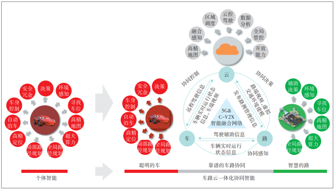 隨著車(chē)輛智能化水平的不斷提高,車(chē)載計(jì)算設(shè)備的算力逐漸難以滿(mǎn)足復(fù)雜路況下實(shí)時(shí)處理大量數(shù)據(jù)的需求,既是成本瓶頸,也是能力瓶頸。為解決這一問(wèn)題,行業(yè)研究出車(chē)路云一體化的技術(shù)演進(jìn)路線(見(jiàn)圖5)。此方案體系下,車(chē)輛通過(guò)高速穩(wěn)定的通信網(wǎng)絡(luò)與云端服務(wù)器、道路感知設(shè)備進(jìn)行實(shí)時(shí)數(shù)據(jù)交互。云端強(qiáng)大的計(jì)算能力既可對(duì)車(chē)輛上傳的大量傳感器數(shù)據(jù)進(jìn)行快速處理和分析,也可處理道路感知設(shè)備上報(bào)的實(shí)時(shí)道路信息和交通狀況。平臺(tái)綜合分析后將決策指令及時(shí)反饋給車(chē)輛,從而輔助車(chē)輛做出更精準(zhǔn)的決策。車(chē)路云一體化的技術(shù)方案可有效彌補(bǔ)車(chē)輛自身算力不足,進(jìn)一步提升智能網(wǎng)聯(lián)車(chē)輛的運(yùn)行效率和安全性,并為降低智能駕駛成本推動(dòng)智能網(wǎng)聯(lián)汽車(chē)快速普及,助力智能交通發(fā)展提供堅(jiān)實(shí)基礎(chǔ)。