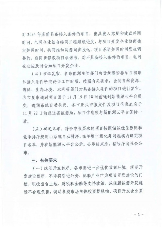 (四)市級復(fù)審。各市能源主管部門負(fù)責(zé)統(tǒng)籌安排項目初審和接入條件研究論證工作時限,按照有關(guān)要求,會同自然資源、海洋、生態(tài)環(huán)境、水利等部門對具備接入條件的項目進(jìn)行復(fù)審。各市復(fù)審?fù)ㄟ^項目須于11月19日18時前通過新能源云平臺提交,逾期系統(tǒng)自動關(guān)閉。各市正式申報文件及項目信息表應(yīng)于11月22日前報送省能源局,項目信息須與新能源云平臺保持一致。
