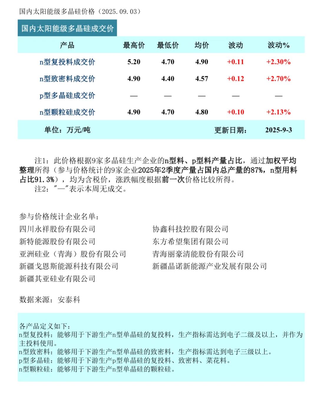 9月3日,中國有色金屬工業(yè)協(xié)會硅業(yè)分會發(fā)布本周多晶硅成交價格統(tǒng)計。n型復(fù)投料成交均價4.90萬元/噸,周環(huán)比上漲2.30%;n型致密料成交均價4.57萬元/噸,周環(huán)比上漲2.70%;n型顆粒硅成交均價4.80萬元/噸,周環(huán)比上漲2.13%。