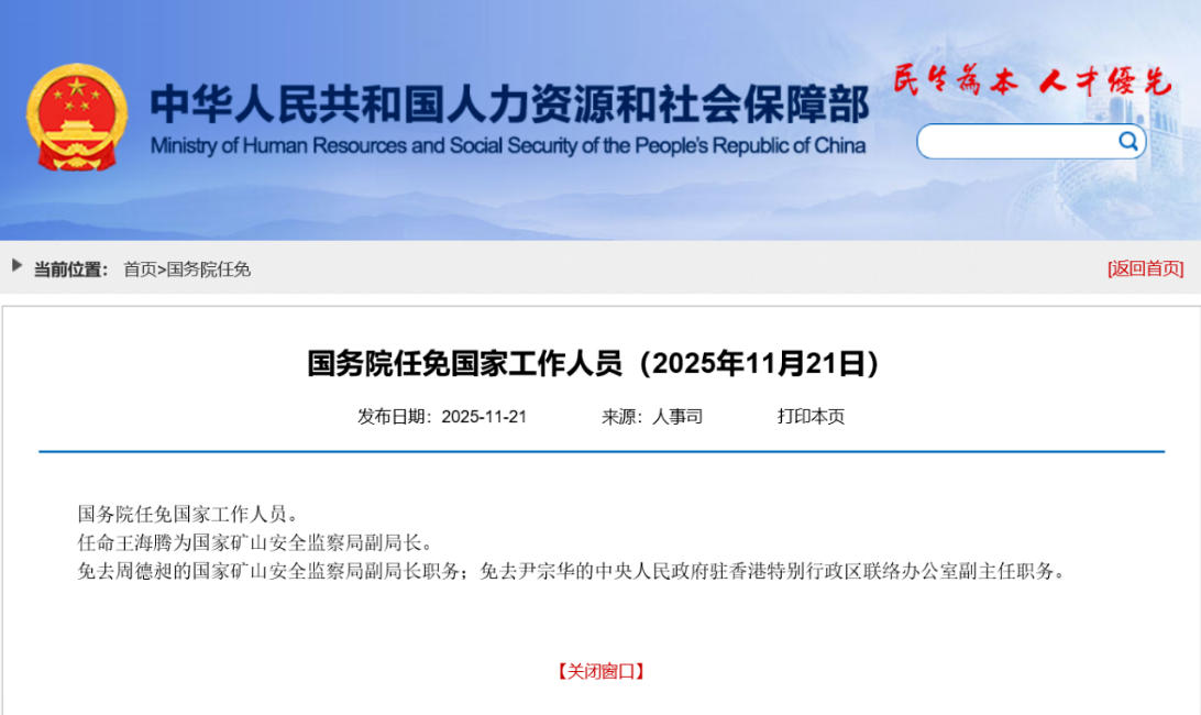 人社部網站11月21日消息:國務院任免國家工作人員。任命王海騰為國家礦山安全監(jiān)察局副局長。
